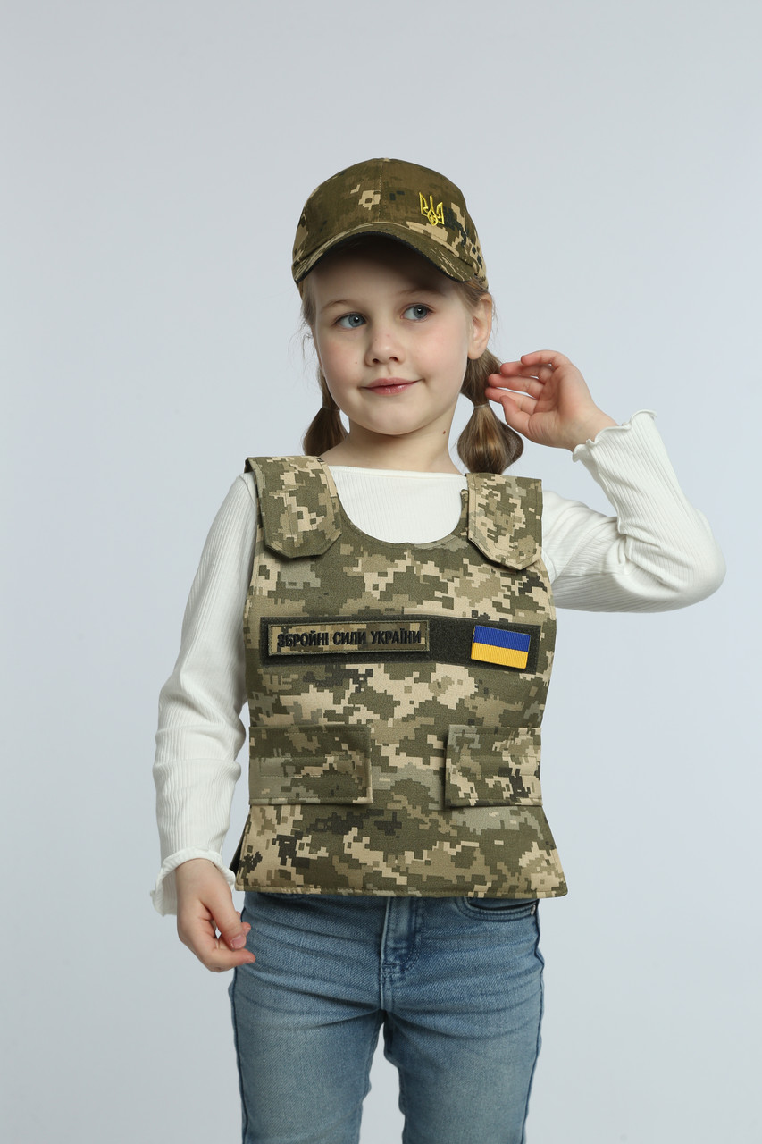 Дитячий костюм Бронежилет з бейсболкою для хлопчиків та дівчаток на 5-7 років. Пошитий із тканини змішаного складу, малюнок спеціалізований, складається з м'якого бронежилета з нашивкою та прапора України. Ширина передньої та задньої частини бронежилета 31 см, довжина 35 см. За рахунок липучок на плечах та талії можна регулювати довжину та об'єм бронежилета. По передній частині бронежилета нашита петельна стрічка шириною 4 см, на неї можна кріпити любі патчі, нашивки та шеврони.