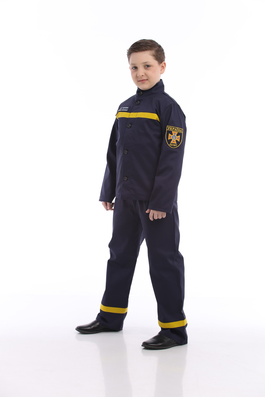 Костюм Юний рятувальник ДСНС виконаний з міцної саржевої тканини синього кольору, що надає йому професійного вигляду. Він складається з піджака і штанів. Піджак застібається на гудзиках, надаючи йому зручності та легкості, штани мають резинку, що забезпечує комфорт та хорошу посадку на тілі. На рукаві та на грудях розташовані шеврони, які підкреслюють його реалістичність. На задній частині піджака розташований напис Юний рятувальник (термоналіпка).