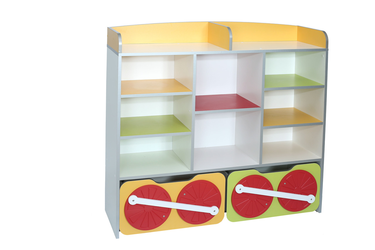 Стелаж для іграшок призначений для комплектації дитячих садків. Виготовлений із ламінованої ДСП. Яскраві кольори стелажика забезпечують святковий настрій, а дизайн — зручність використання. Стеллаж доступний тільки в кольорі білий + жовтий + лайм + червоний.